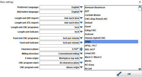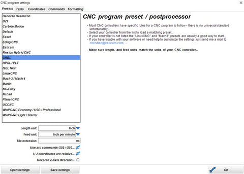Open the CNC Program Settings. This is where you will select the postprocessor used by your CNC. A postprocessor acts like an editor, ensuring that the gcode generated by Estlcam will work with your CNC. BobsCNC Routers use GRBL firmware to calculate and then send step and direction commands to the stepper or servo motors on each of the axes (X, Y, and Z).