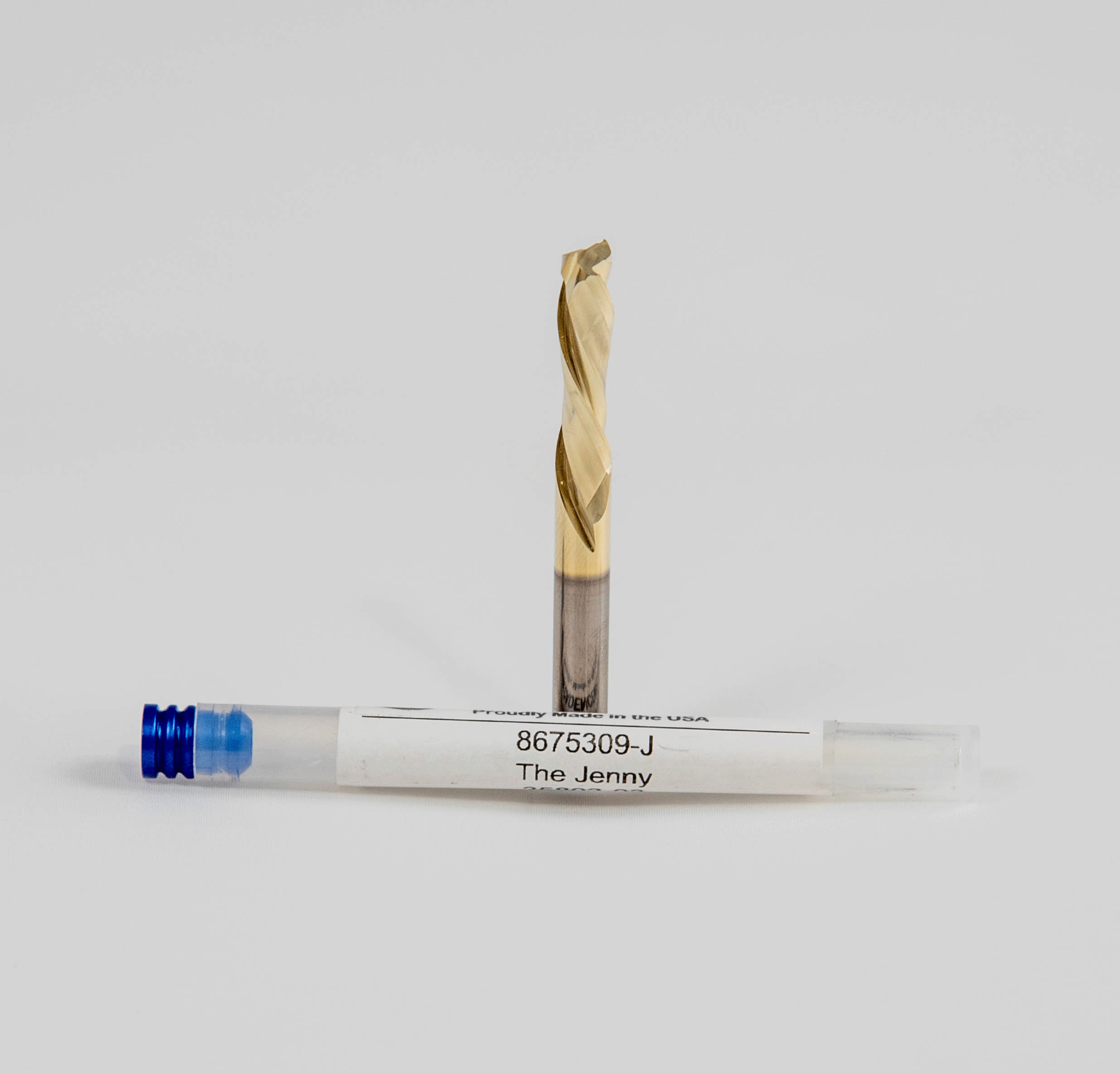 The Jenny bit is proudly American made. Designed by Woodworkers for Woodworkers in Tempe AZ. While other companies might offer similar tools, the Jenny has been designed to give you the desired results of a standard compression bit without a deep depth of cut. This is ideal for less rigid machines. In addition to the .100” up-shear geometry, the Jenny has a larger core increasing the integrity and strength of the tool itself. Couple that with a unique helix and relief angle flute geometry and you have a tool that is quickly becoming the go to bit(s) for hobbyists. All Jenny bits have a Zirconium Nitride coating increasing the tool life up to 3X making these bits more economical without compromising quality or finish of your projects.